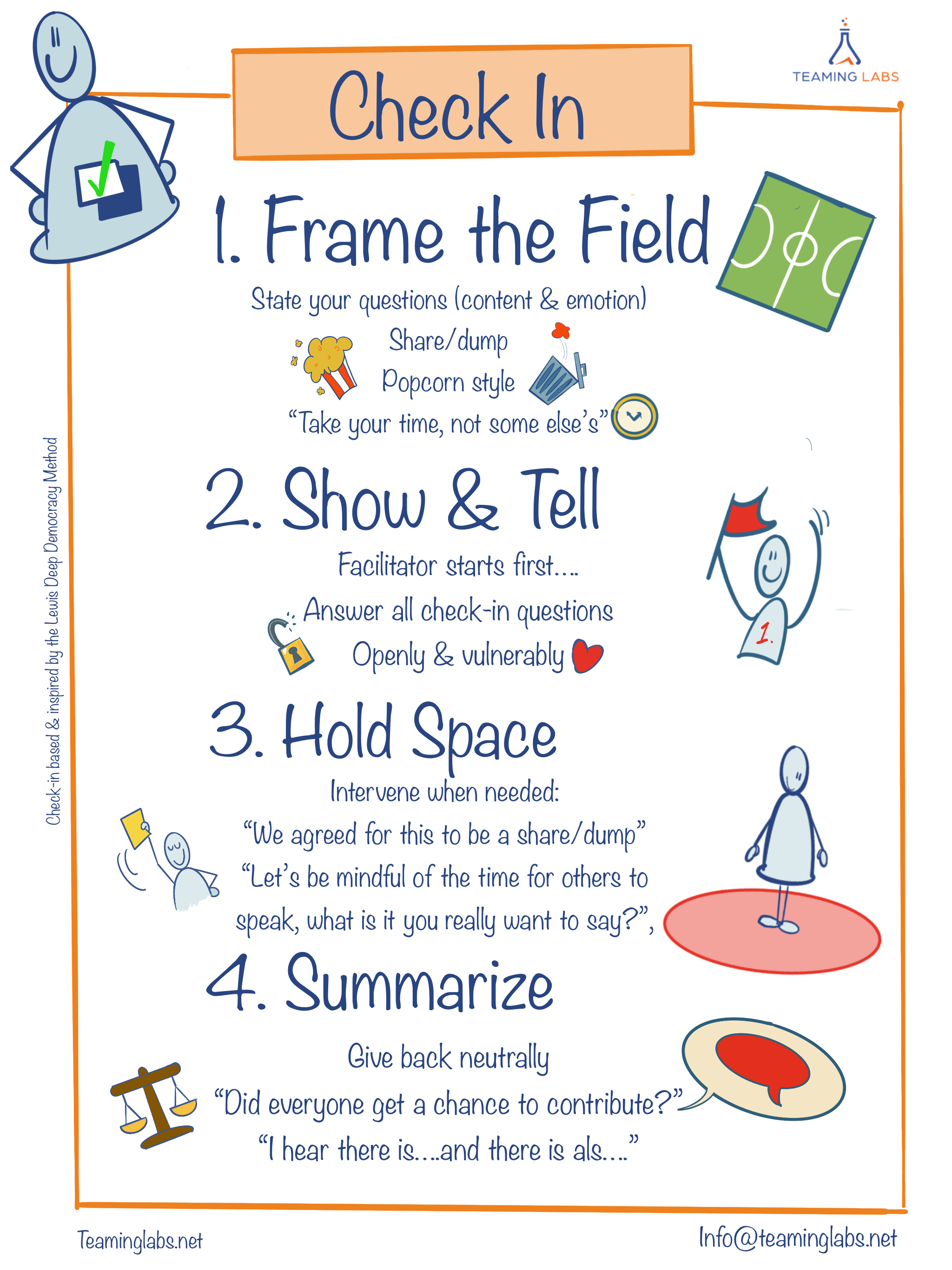 Best for a clear 4-stappen check-in: Kader het Veld → Laat zien & Leid → Houd Ruimte → Vat Samen.